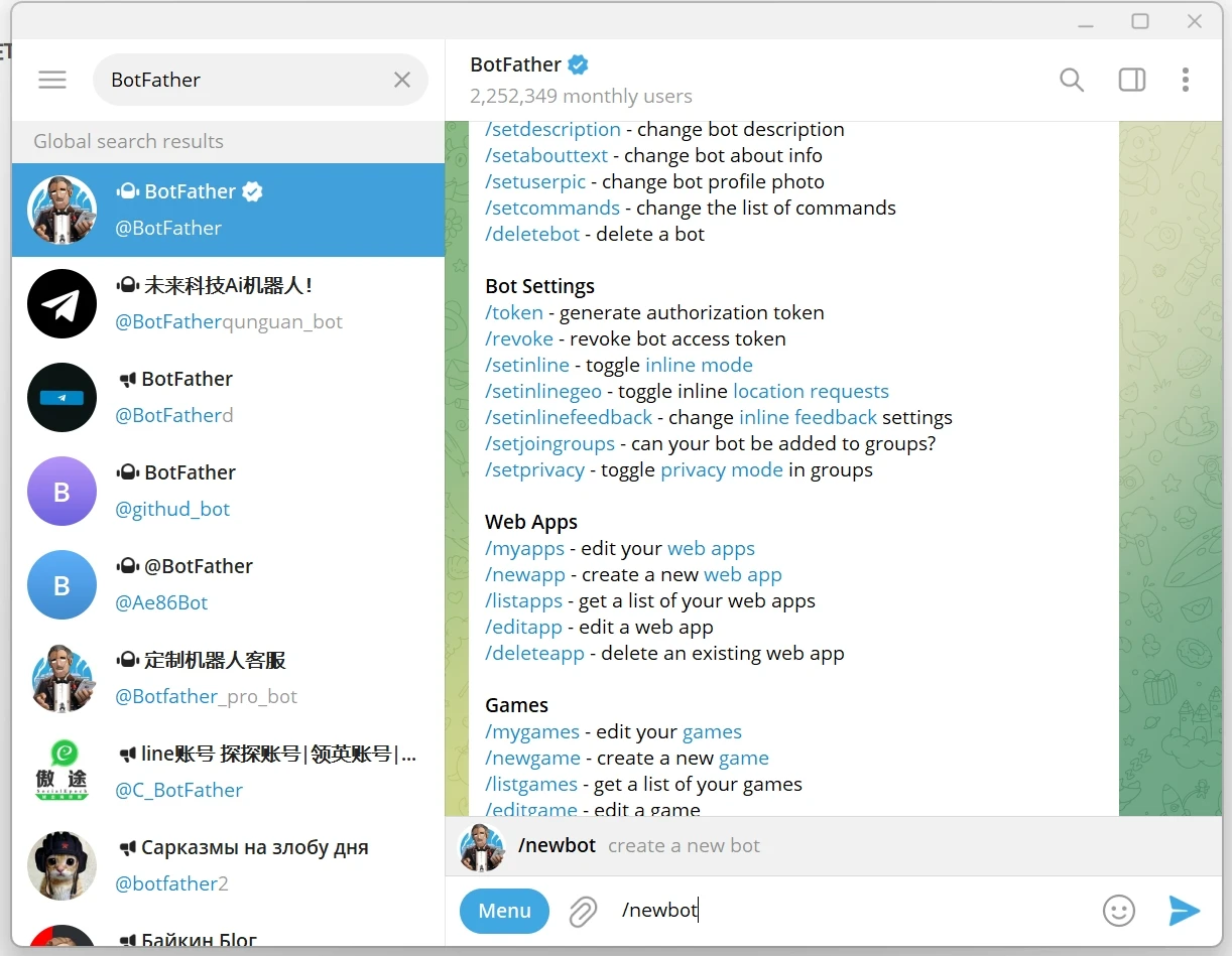 Telegram如何新建机器人? 2024-10-18 19:04 | 8,122 | 0 | 办公网络 44 字 | 几秒读完 1.建立机器人并获取API 在Telegram搜索【@BotFather】,输入【/newbot】 2.获取API 3.在搜索栏搜索 @userinfobot ,获取个人账号ID