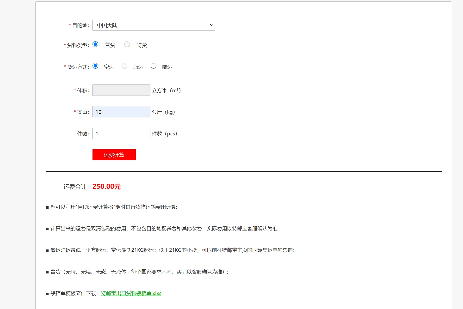 3、运费计算:根据后台添加的地区运费费率,供客户选择查询